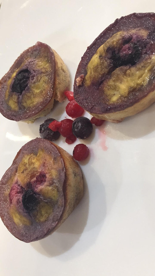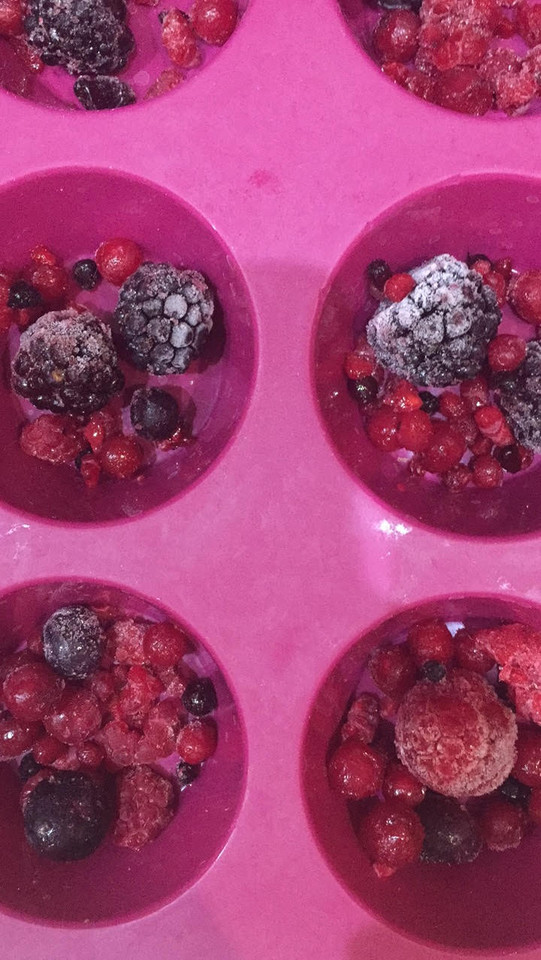 Colocar no fundo das formas os frutos vermelhos a gosto.